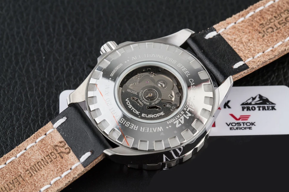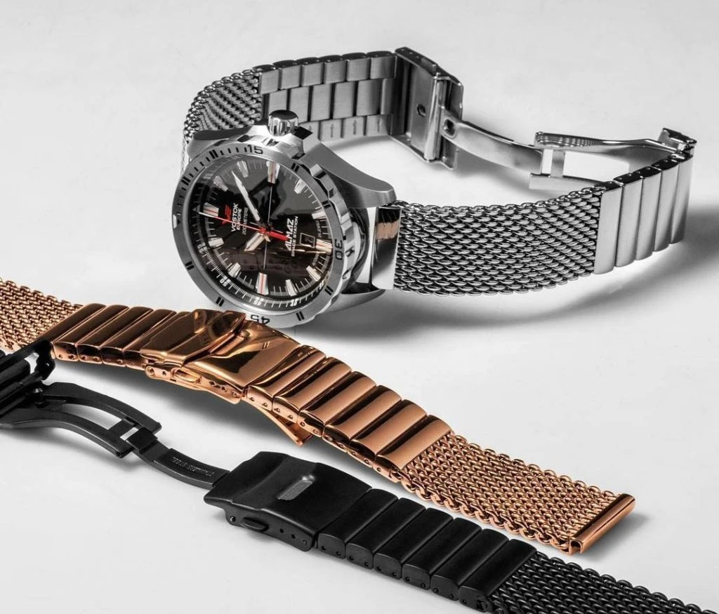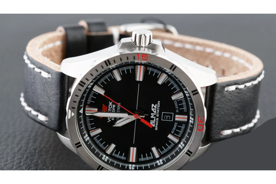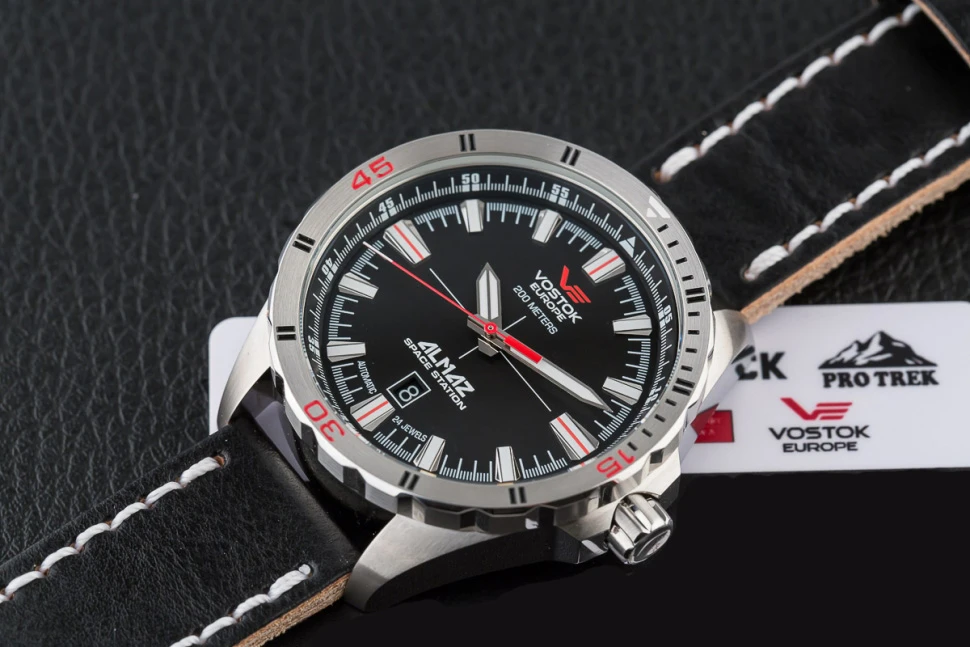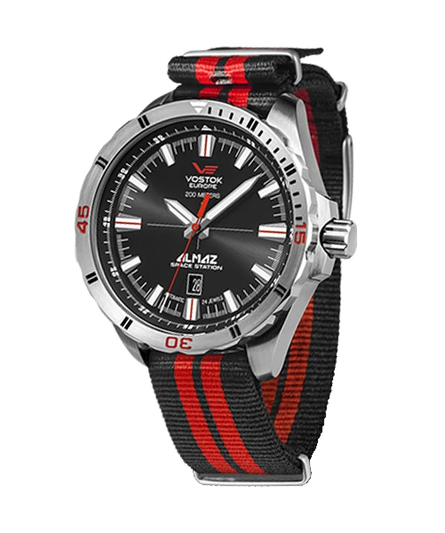 Important note: in addition to the steel bracelet, the Vostok-Europe Almaz is delivered with a Nato Black and Red bracelet, interchangeable thanks to a simple spring bar.