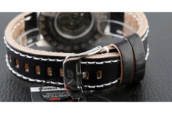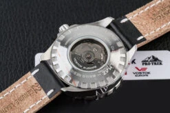 The silver PVD case is mounted on a black genuine leather bracelet, magnifying the timepiece … On the back, there is a transparent background to admire the mechanism.