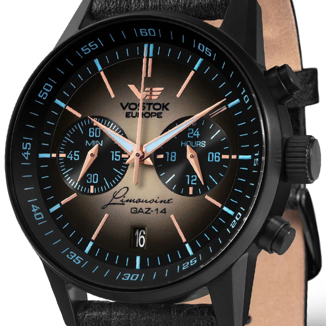 The VOSTOK-EUROPE Gaz 14 Limousine Chrono VK64-560C601 deserves its status as the brand’s best-seller. With a smooth dial reminding us of contemporary watch designs, a Seiko meca-quartz movement and a genuine leather strap gracefully styled, the Gaz 14 Limousine is all about a great timepiece with a rare price / quality ratio in Europe.