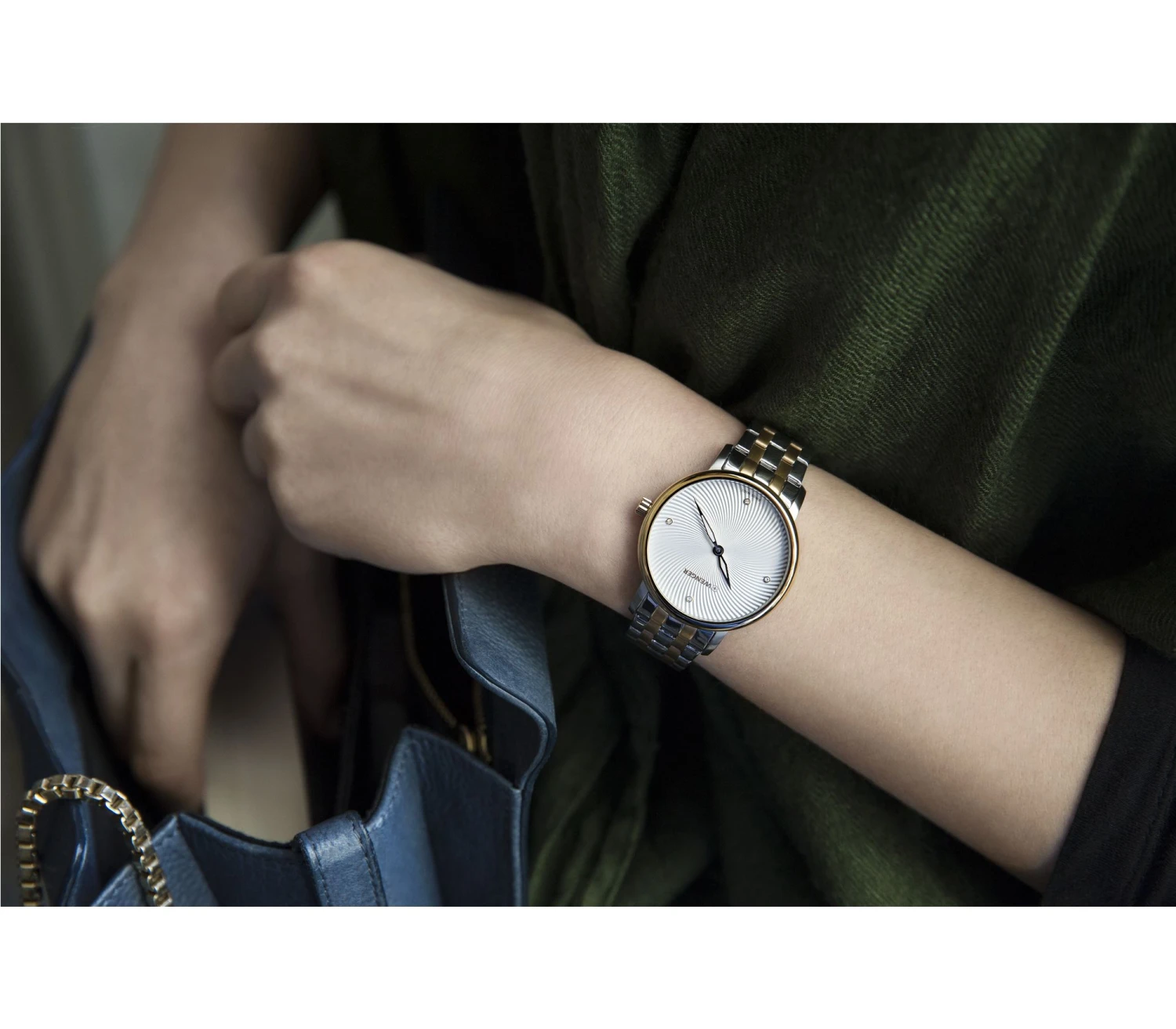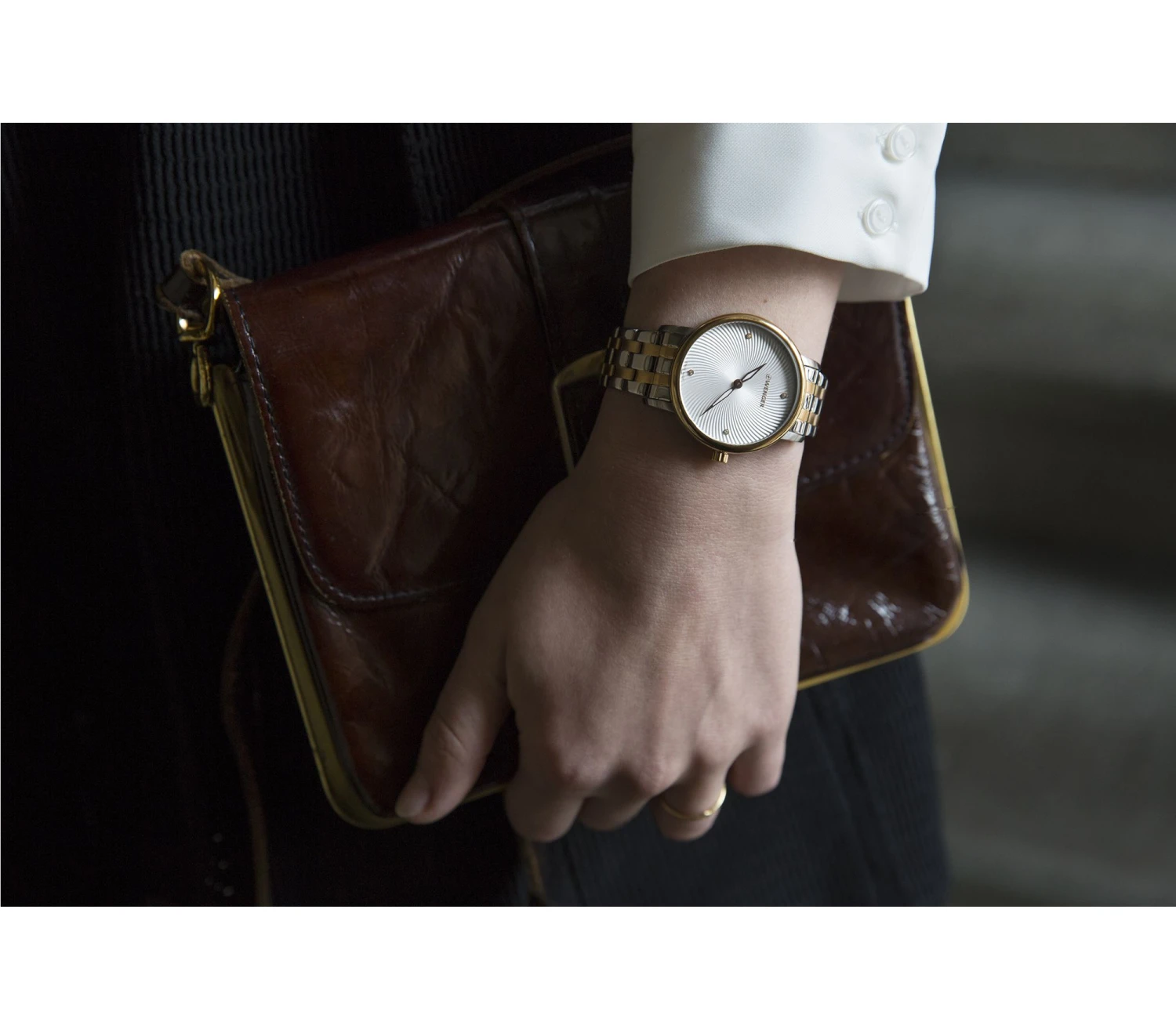 The Urban Donnissima collection is a subtle blend of femininity and refined elegance. Designed for multiple uses, the new Urban Donnissima watch will accentuate your elegant evening wear or perfectly match a more casual style. The large opening of the brushed and polished 35mm case highlights its beautiful guilloche dial, set with four small crystals and accented with fluorescent leaf-shaped hands.