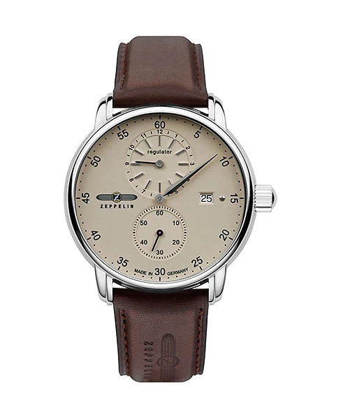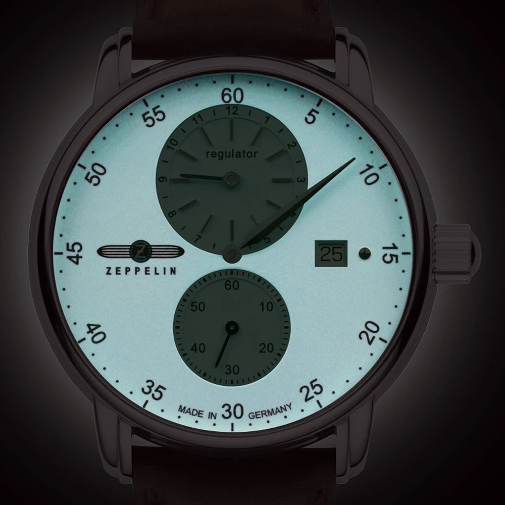 The Sellita SW2600 movement, Swiss Made, known for its robustness and longevity, equips the Zeppelin New Captain’s Line Regulator model. With 31 jewels, it has a 40-hour power reserve.