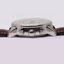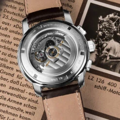 – The topstitched brown leather strap is hand sewn in Germany. It guarantees top quality for this part often overlooked by manufacturers.