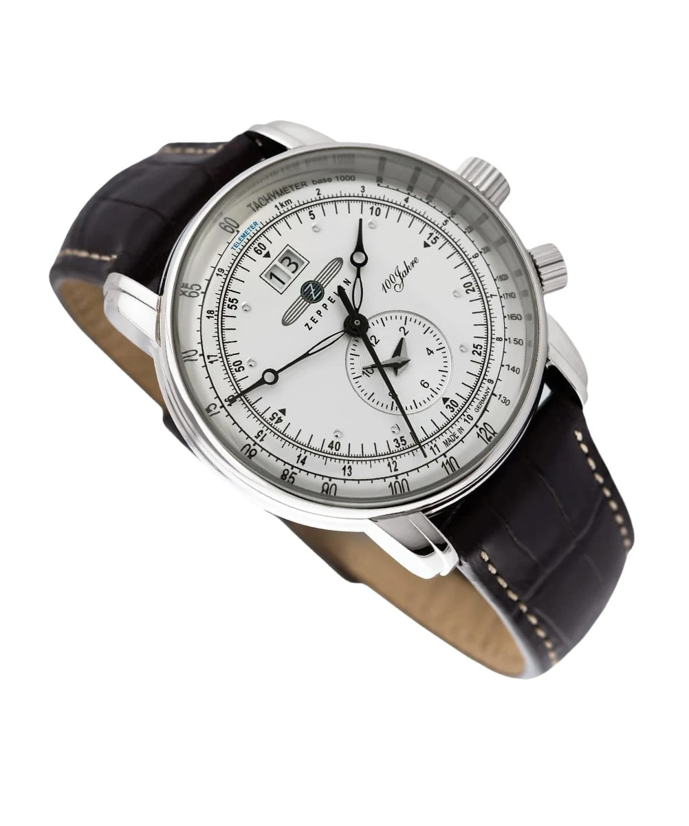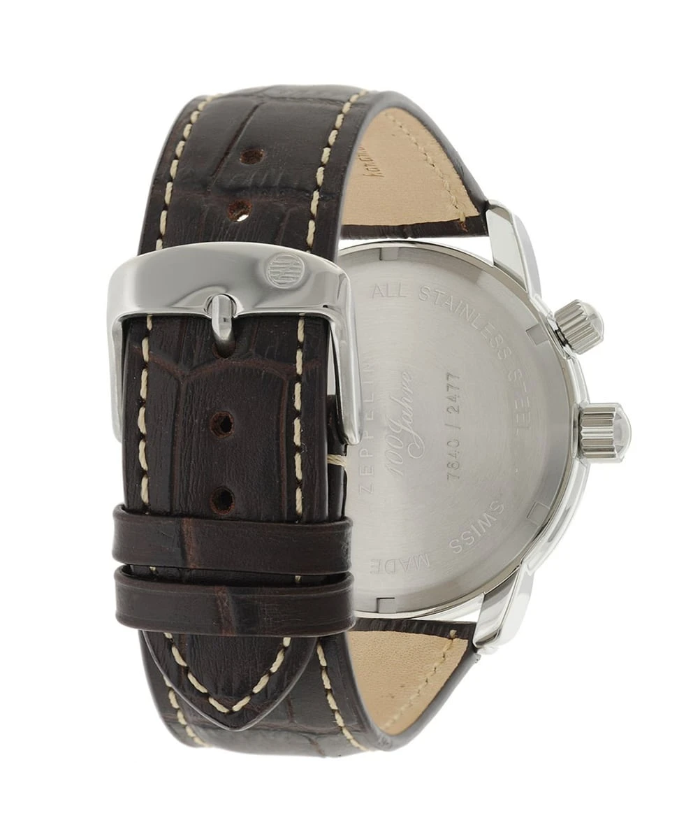 Featuring a white dial, the 100 Jahre Zeppelin Brown Leather model is equipped with a Mineral glass guaranteeing an original design.